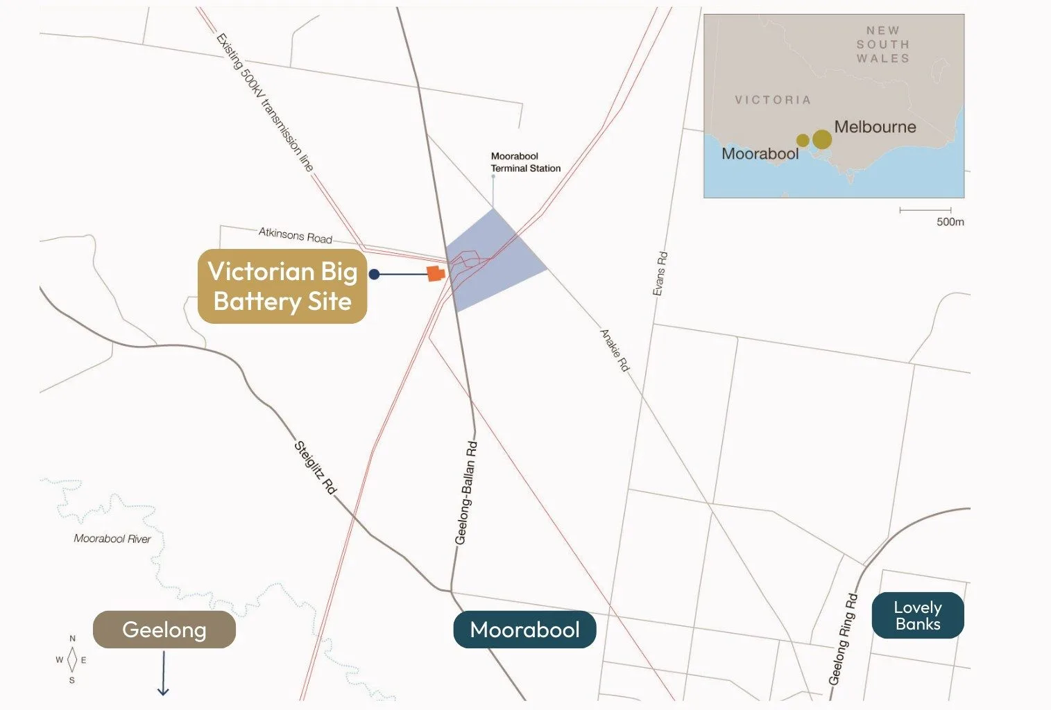 The Victorian Big Battery is located next to AusNet Services’ existing Moorabool Terminal Station, approximately 13km northwest of Geelong.